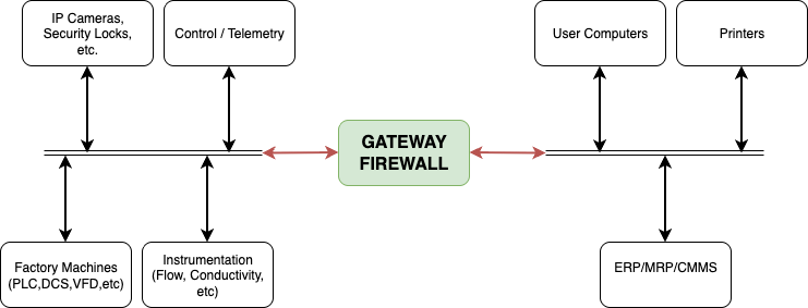Notice that there is still communication between the OT and IT networks. However, that communication is limited to specific use cases by means of a Gateway or Firewall. This limits the sources and destinations allowed, the ports to be used, etc.
