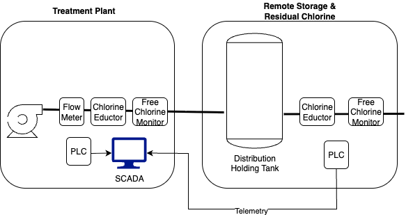 Clearly the remote system is prone to attack, and may have a remote PLC using Modbus control. To get the telemetry back to the centralized system in a secure manner, Telemetry is used. However, that telemetry can be attacked. For example, the Free Chlorine signal can be spoofed. In this case, the residual Chlorine level can be made and recorded as in compliance while the remote control loop is told to introduce Chlorine at harmful levels.