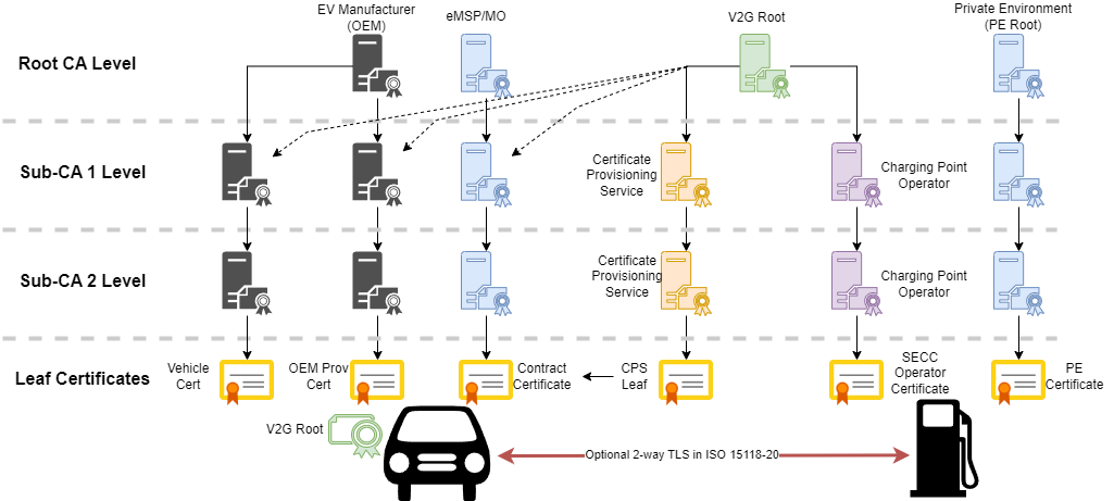 ISO 15118-2 and -20 define multiple possible ecosystem PKIs that must interact. Each PKI can be up to a three-tiered PKI.