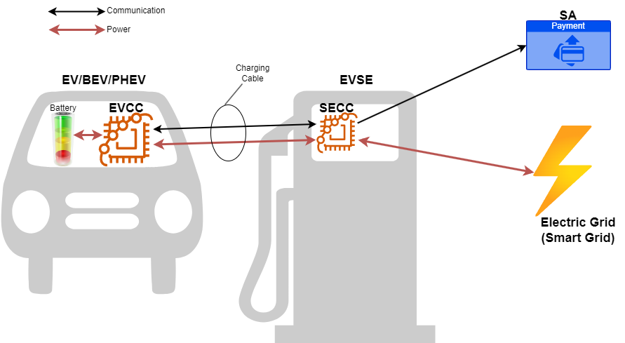 Internal to the EV is an Electric Vehicle Communications Controller (EVCC). Internal to the EVSE is a Supply Equipment Communication Controller (SECC). Therefore, the standard defines a Vehicle-to-Grid-Transport-Protocol (V2GTP) that uses Transport Control Protocol (TCP), Transport Layer Security (TLS), and IPv6 sitting on the IP protocol.