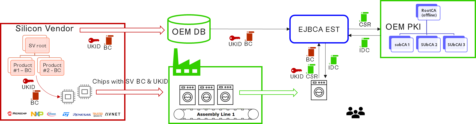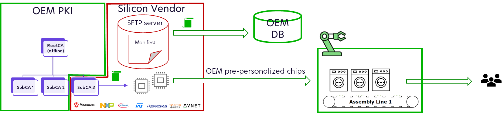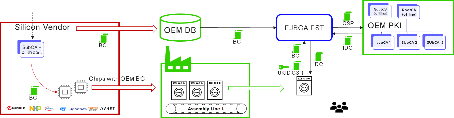 OEM sets-up his PKI for Initial Device Certificates and signs issuing CAs for Silicon Vendor or distributor factory
